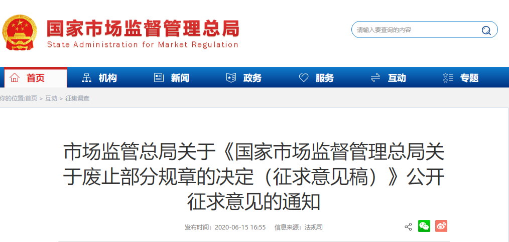 市場總局關(guān)于《國家市場監(jiān)督管理總局關(guān)于廢止部分規(guī)章的決定(征求意見稿)》公開征求意見的通知